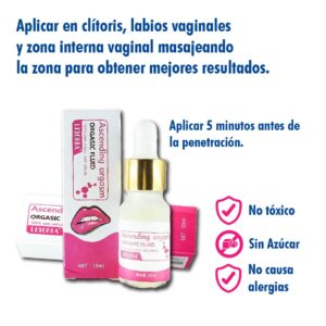 - Modo de uso: Aplicar 1 a 2 gotas en el clítoris y labios vaginales, realizar masajes para mejores resultados, el producto actúa a los 2 minutos y su efecto dura alrededor de 45 minutos.